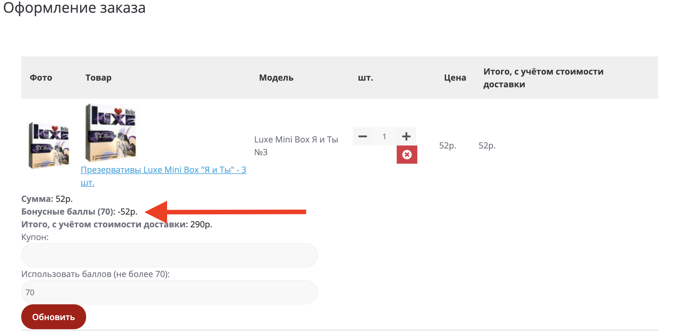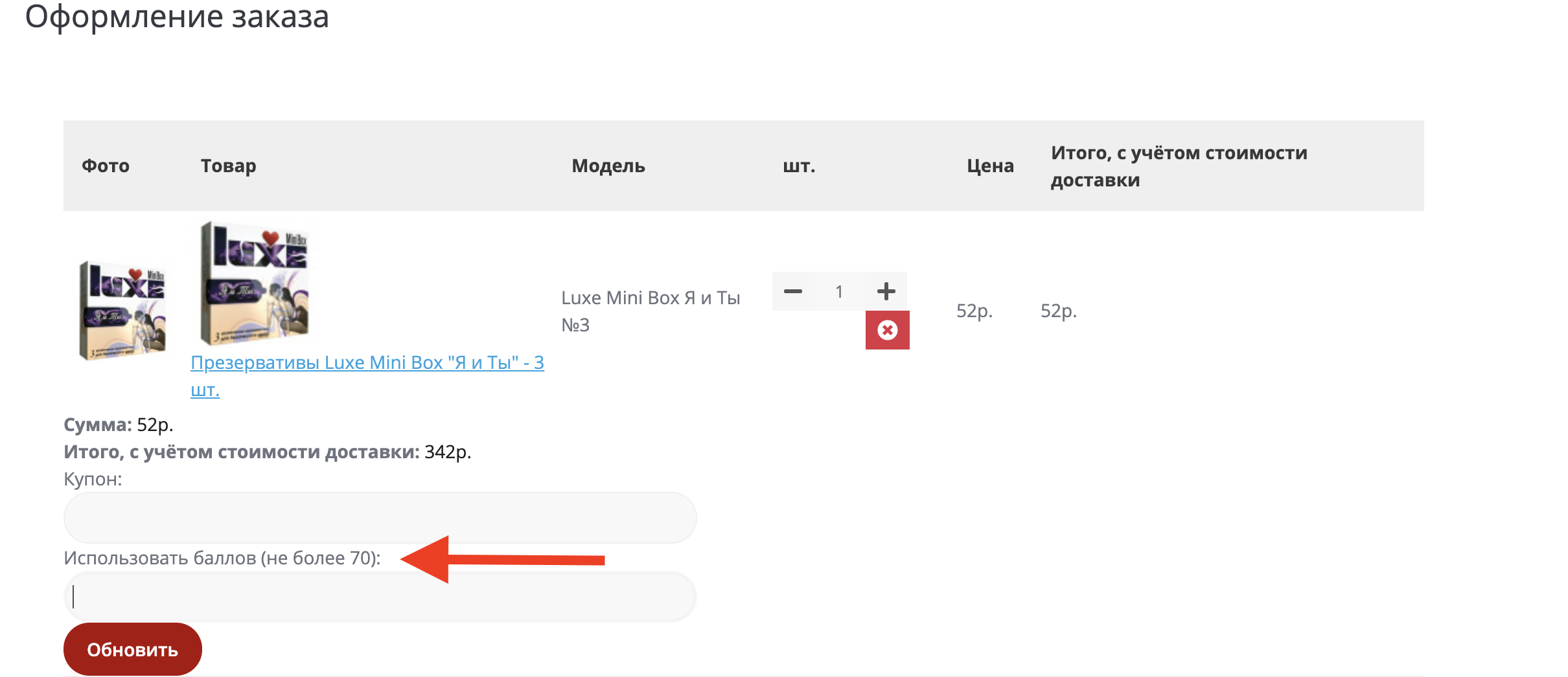 7) Вводите нужное количество бонусов для совершения покупки! После ввода, нажмите на кнопку "обновить" и увидите как сумма заказа меняется